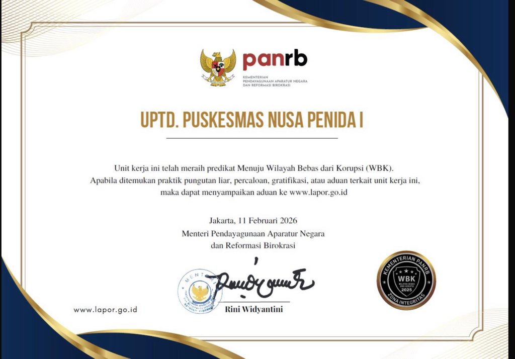 Dengan penuh rasa syukur, UPTD Puskesmas Nusa Penida I berhasil meraih penghargaan Zona Integritas menuju Wilayah Bebas dari Korupsi (WBK). Pencapaian ini menjadi tonggak penting dalam perjalanan peningkatan kualitas pelayanan publik, sekaligus bukti nyata komitmen seluruh jajaran dalam mewujudkan tata kelola yang bersih, transparan, dan profesional.