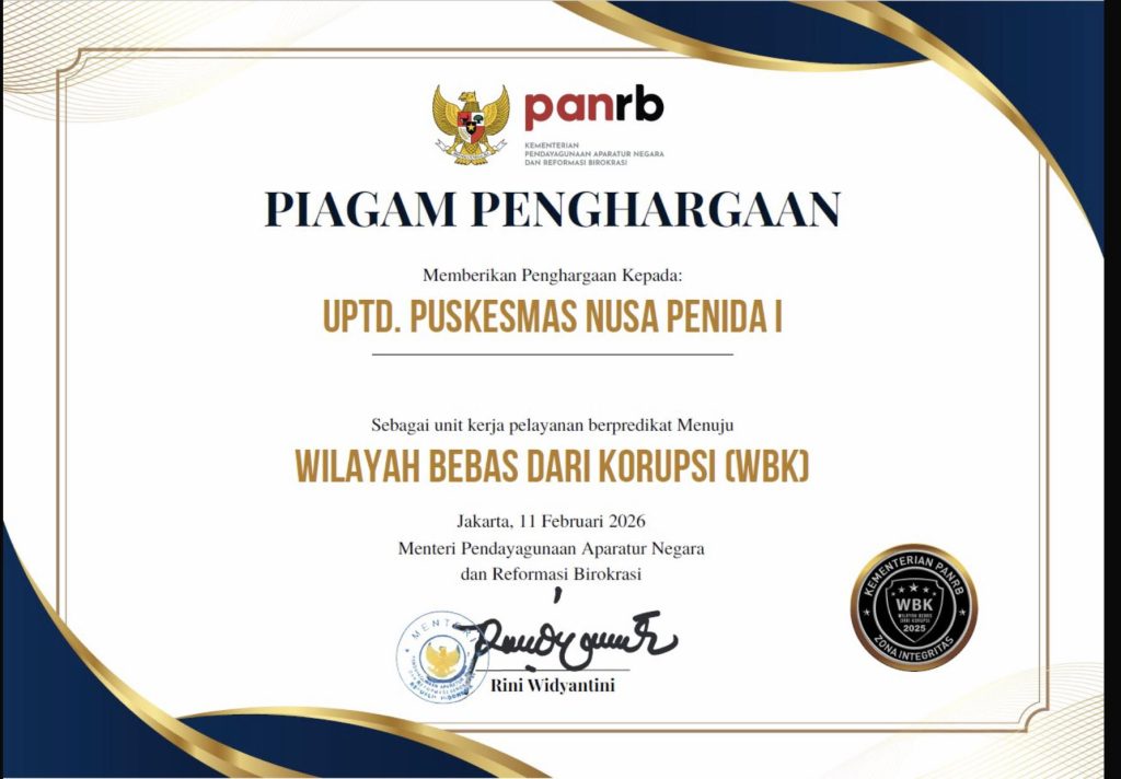 Penghargaan ini mencerminkan kesungguhan Puskesmas Nusa Penida I dalam membangun budaya kerja yang berintegritas, serta menghadirkan pelayanan yang berorientasi pada kepuasan masyarakat.