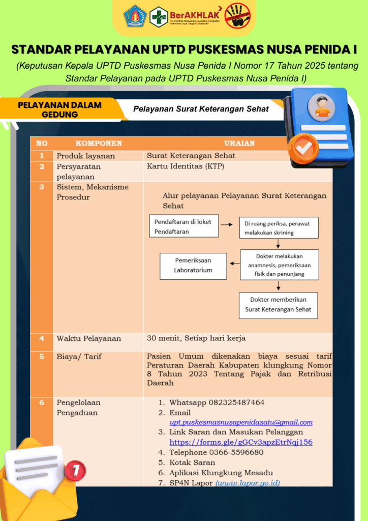 Berikut merupakan Standar Pelayanan UPTD Puskesmas Nusa Penida I sebagai bentuk komitmen kami dalam memberikan pelayanan yang prima, cepat, tepat dan transparan.